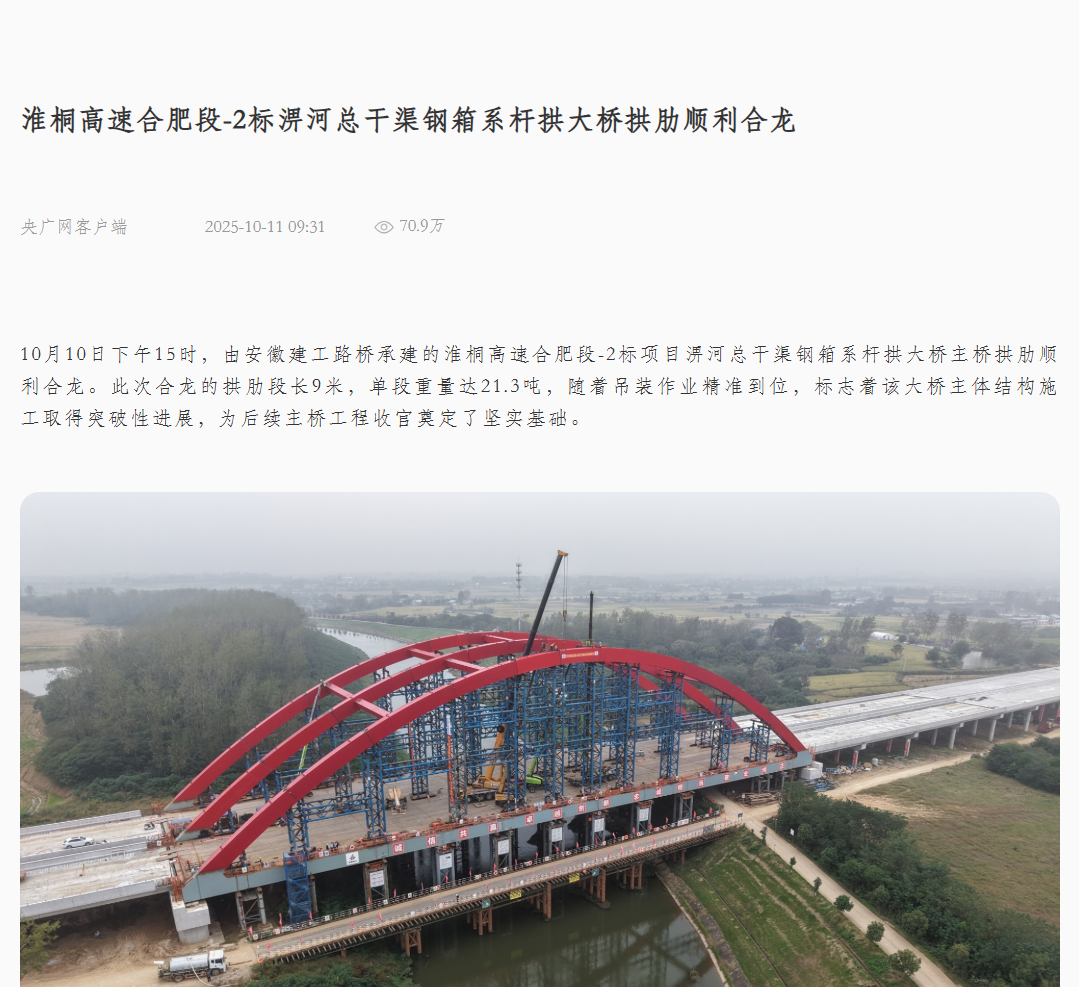 近日,央廣網(wǎng)、安徽日?qǐng)?bào)、安徽交通運(yùn)輸、大皖新聞等主流媒體聚焦報(bào)道淮桐高速合肥段路基2標(biāo)淠河總干渠大橋拱肋合龍。
