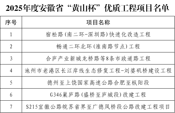 近日,安徽省住房和城鄉(xiāng)建設(shè)廳公布了2025年度安徽省“黃山杯”優(yōu)質(zhì)工程項(xiàng)目名單,公司7個(gè)項(xiàng)目榮耀登榜,創(chuàng)下公司年度獲獎(jiǎng)數(shù)量歷史新高,獎(jiǎng)項(xiàng)涵蓋公路、市政等多個(gè)領(lǐng)域,充分彰顯了公司在工程建設(shè)領(lǐng)域的雄厚技術(shù)實(shí)力與精益求精的匠心品質(zhì)。